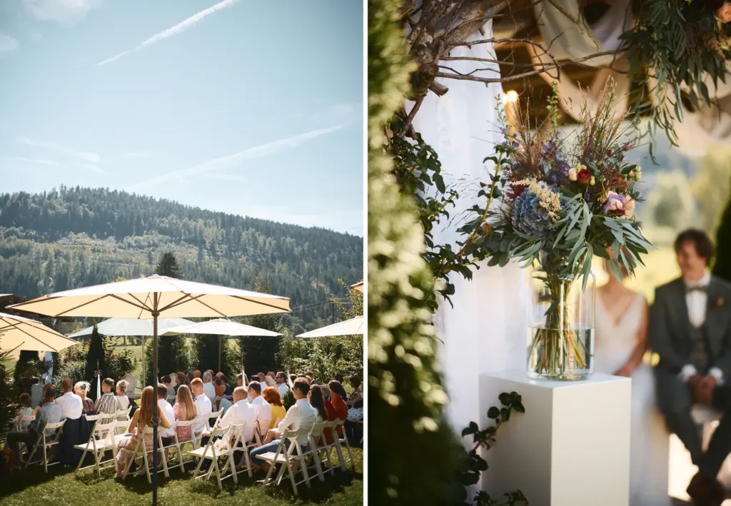 Die freie Trauung fand unter freiem Himmel statt, umgeben von blühenden Sommerwiesen und der warmen Sonne. Die emotionale Zeremonie war geprägt von tiefen Worten, die direkt aus dem Herzen kamen. Jedes Lächeln, jede Träne und jedes zittrige „Ja“ erzählten ihre eigene Geschichte. Die persönliche Note, die das Paar in die Zeremonie eingebracht hat, machte den Moment besonders intim und unvergesslich – nicht nur für die Gäste, sondern auch für mich als Fotografen.